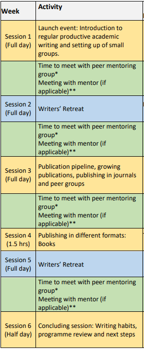 Each programme is different, and can be tailored around the needs of the community involved. I’ve run a 12-month one, with a looser structure and more attention to community interaction around monthly writers’ retreats. I’ve run one that focused almost entirely on individual 1:1 coaching support. And I’ve run a one-month ‘WriteFest’ one, for PhD students, that hung on weekly online discussion groups.